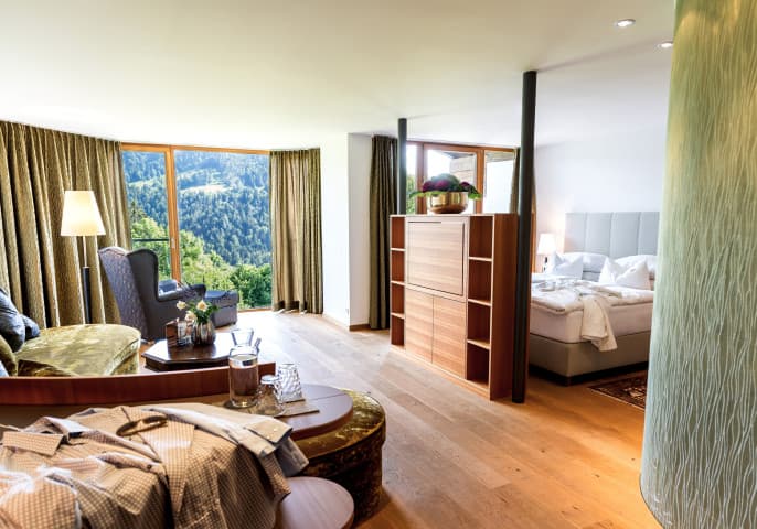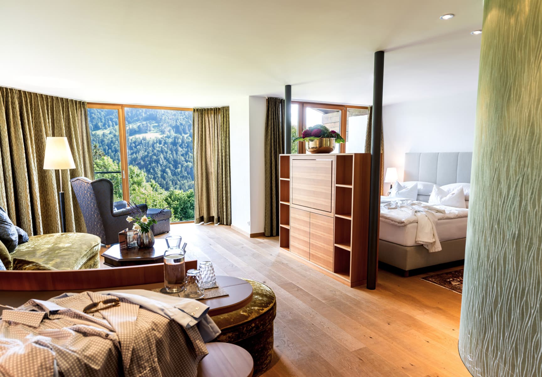 Unsere Panoramasuite besicht mit einer fantanstischen Aussicht auf Wiesen, Wälder, Hügel bis zur Winterstaude, viel Raum und edler Ausstattung! Für alle, die die Weite lieben!