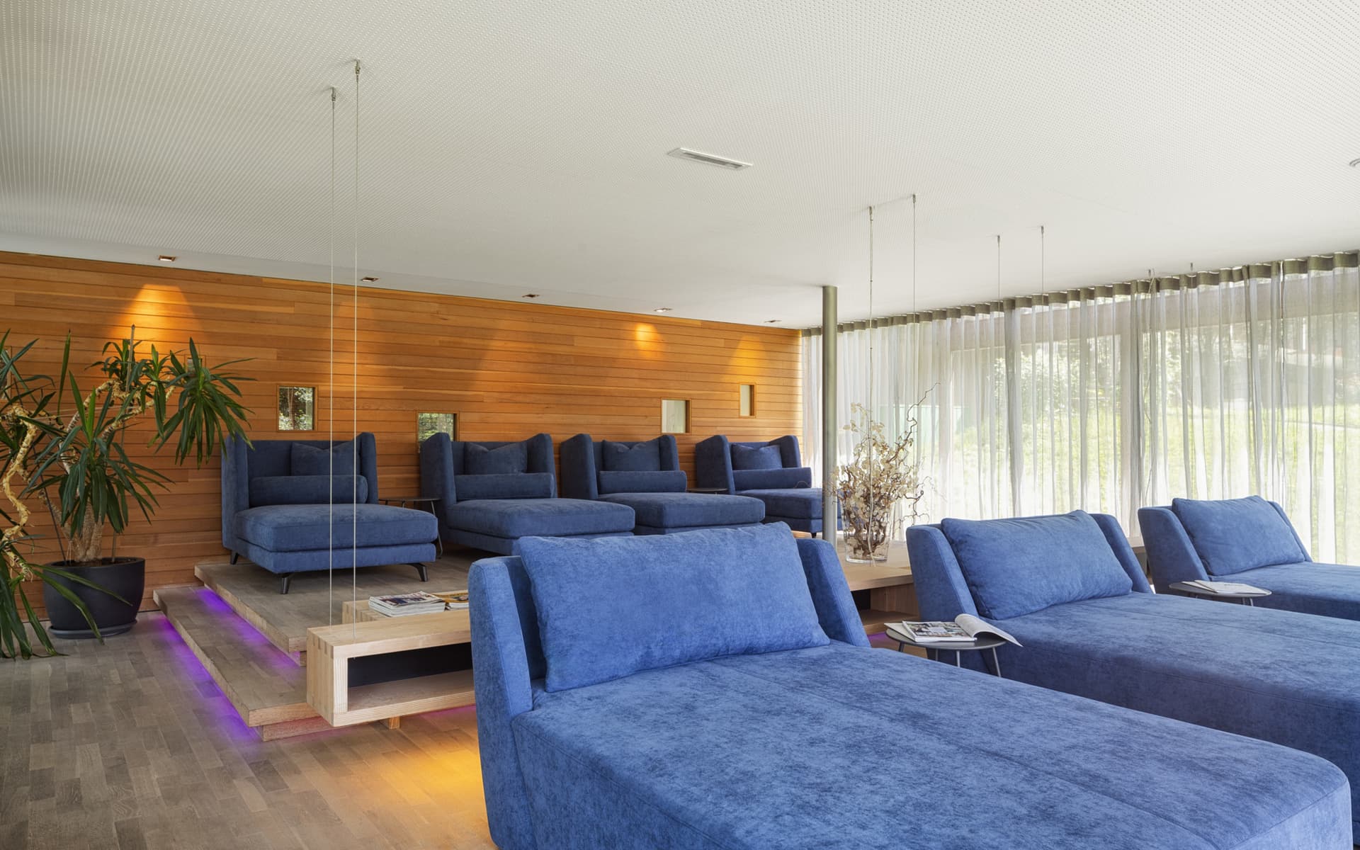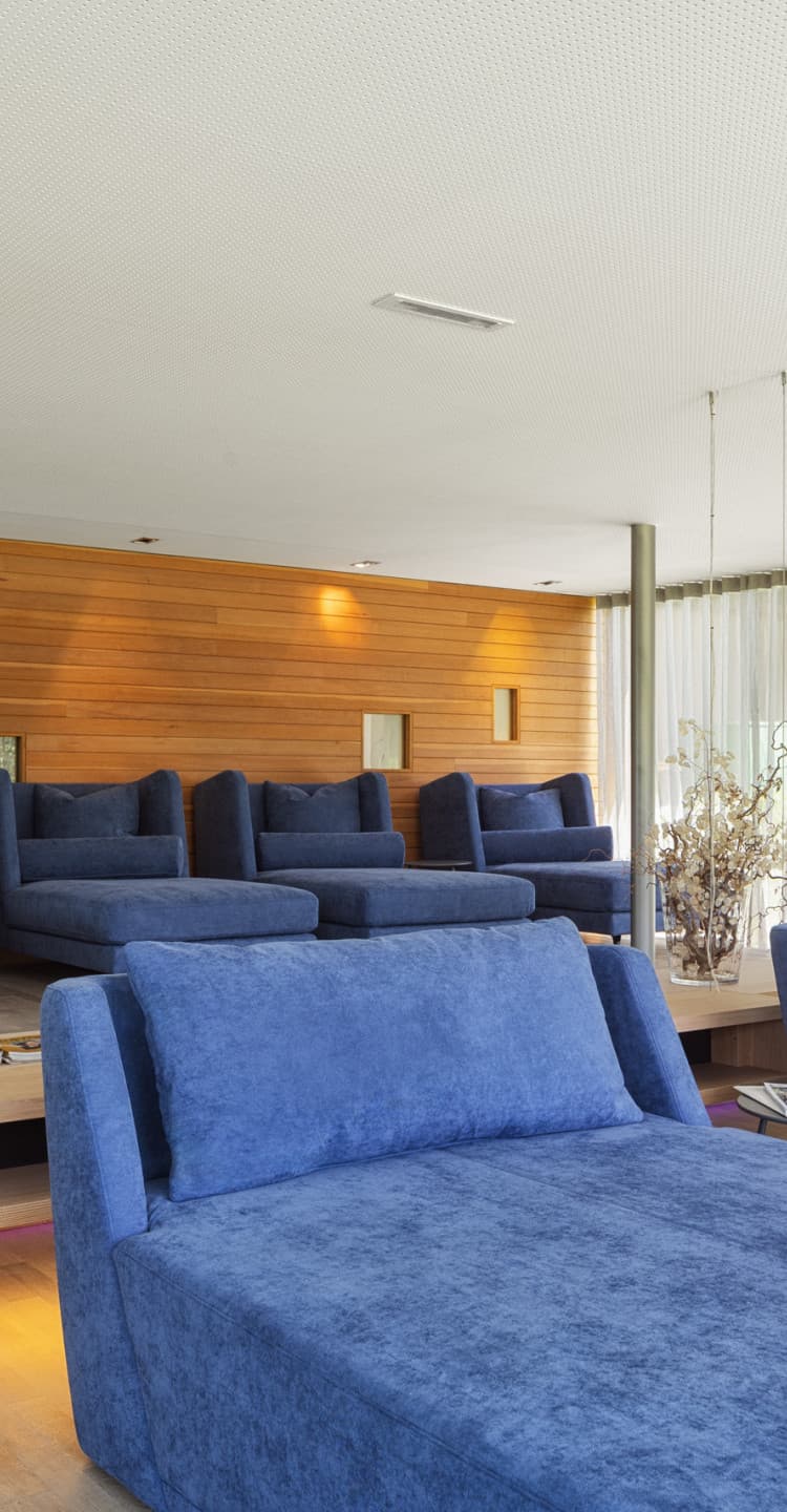 Badestube mit finnischer Sauna, Lichtwechsel-Biosauna, Soledampfbad und Infrarotkabine. Lichtdurchfluteter Pavillon mit hochwertigen Magazinen, Indoor-Einstieg in den Pool und direktem Gartenzugang.
