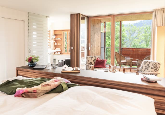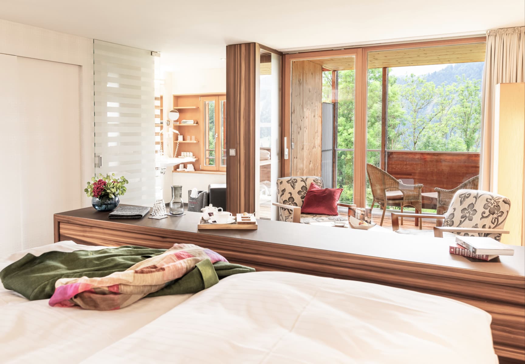 A welcoming junior suite, spacious and bright, with a south-facing balcony overlooking the garden and a wonderful view!
